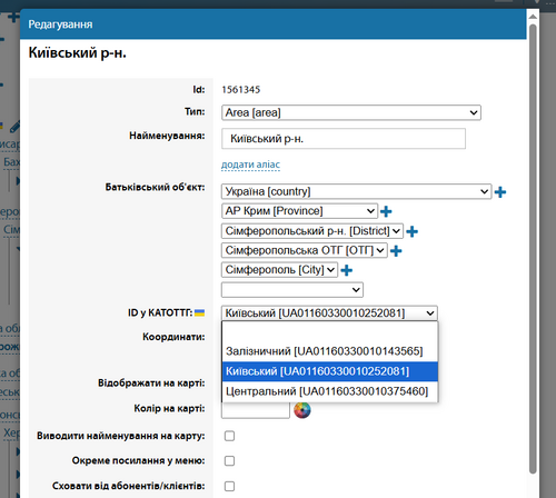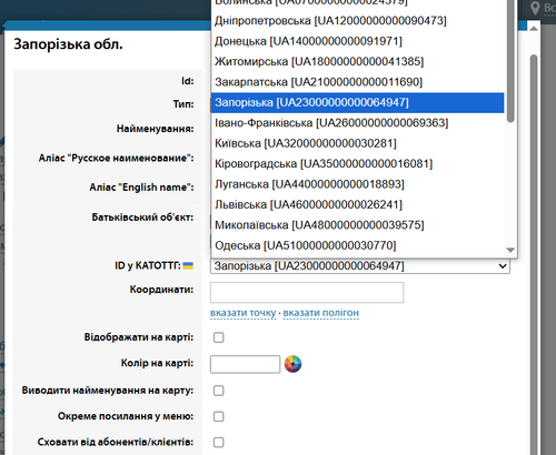 Після цього можна для областей та всіх дочірніх об'єктів вказувати їх ID у КАТОТТТГ