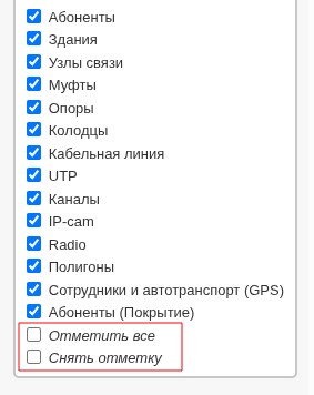 На карте можно отображать различные слои. Выбранные слои сохраняются для каждого оператора индивидуально и отображаются вновь при открытии карты. Дополнительными слоями могут выступать метки на оборудовании/линиях связи. Есть возможность выводить номера объектов инфраструктуры (узлы/опоры/колодцы/муфты) или домов и размещать собственные произвольные надписи.