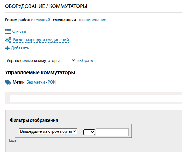 В фильтр по коммутаторам добавлена возможность отображения устройств с вышедшими из строя портами