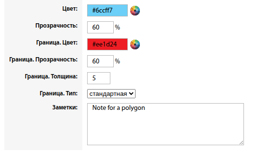 Для объектов на карте (полигоны) добавлена возможность указывать прозрачность и внешний вид границы объекта