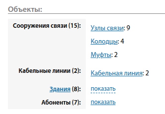 В карточке полигона (объекта на карте) выводится список сооружений связи, которые он покрывает