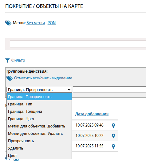 Для объектов на карте добавлены групповые действия (добавление, снятие метки)