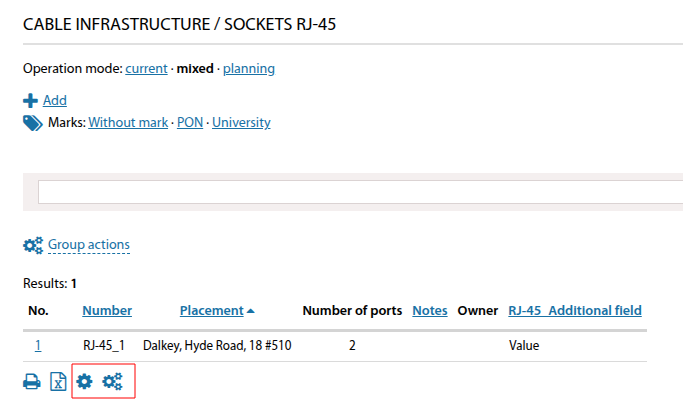 For each category of cross-connects/ODFs (patch panels, sockets), it is possible to configure separate additional fields, marks for objects, and table display settings