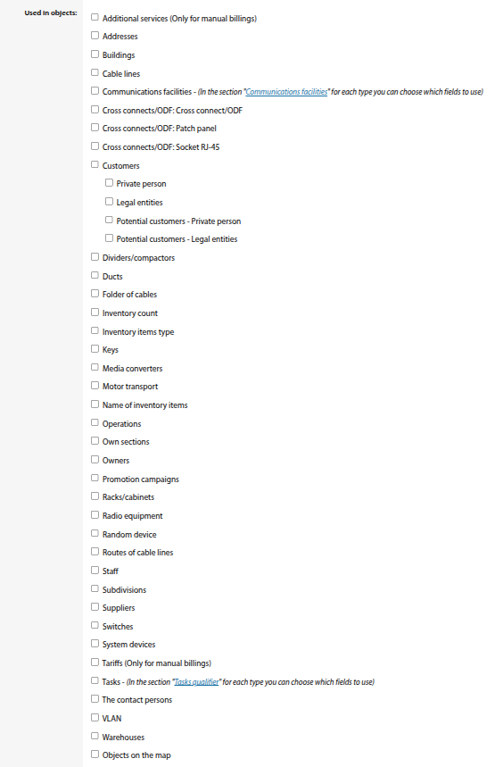 Separate setting of table fields for each type of communication installations is provided (starting from version 3.17).