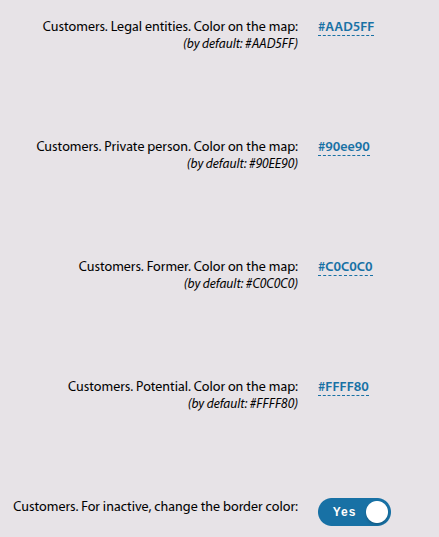 For customers of different categories, icon colours on the map can be configured (private persons, legal entities, former customers, potential customers). Icon border customisation for inactive customers is also available