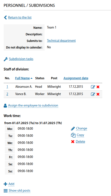 In the subdivision card, you can edit the necessary information and assign or exclude an employee to a subdivision if necessary.