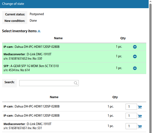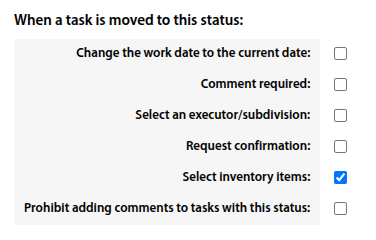 When closing a task, it is now possible to select which inventory items (Inventory) from all available should be transferred to the task and in what quantity (customisable)