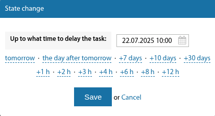 Also in the dialogue window, when a task is put into the "Delay" status, several fixed intervals (day after tomorrow, +7 days, +10 days...) are offered to choose from (since version 3.17).